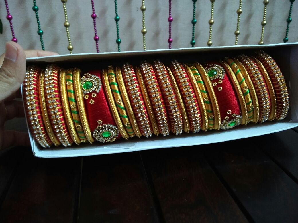 Materials used are metal bangles, silk thread, Kunden stones, beads etc.
